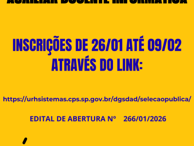 PROCESSO SELETIVO SIMPLIFICADO PARA AUXILIAR DOCENTE🔷ÁREA DE ATUAÇÃO: INFORMÁTICA Acesse o site: https://urhsistemas.cps.sp.gov.br/dgsdad/selecaopublica/>> Selecionar em Escolas Técnicas (Etecs) PROCESSO SELETIVO SIMPLIFICADO AUXILIARES DE DOCENTE>> Clicar em INSCREVA-SE>> Filtro 266 ( Cód. Unidade)