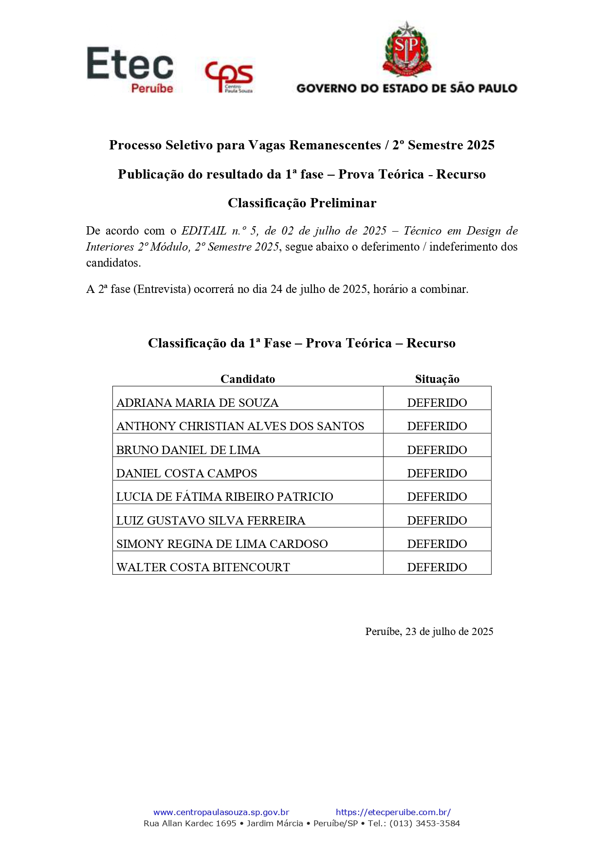 Publicação do resultado da 1ª fase – Prova Teórica – Recurso Clique para baixar >>> Recurso