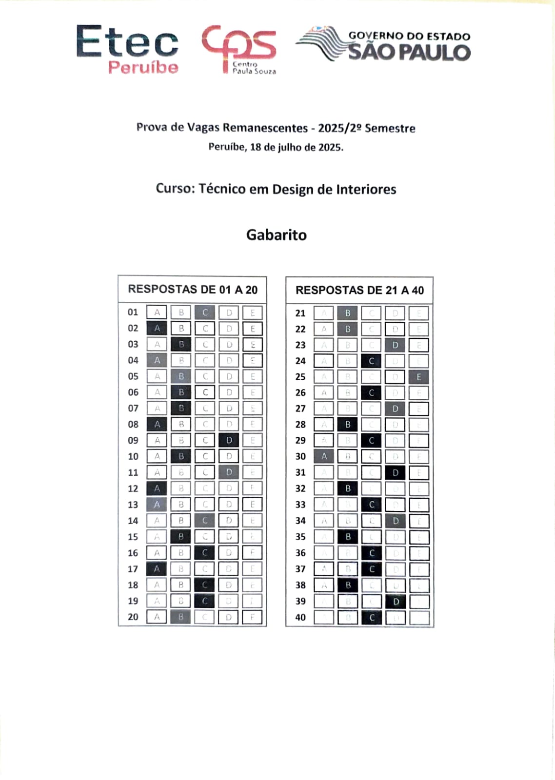 Prova de Vagas Remanescentes – 2025/2º SemestrePeruíbe, 18 de julho de 2025Curso: Técnico em Design de InterioresClique aqui para baixar o arquivo >>> Gabarito Oficial