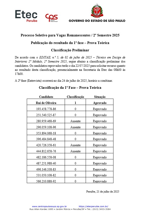 Vagas Remanescentes – 2025/2º Semestre Peruíbe, 18 de julho de 2025Curso: Técnico em Design de Interiores Clique aqui para baixar o arquivo >>> Classificação Preliminar